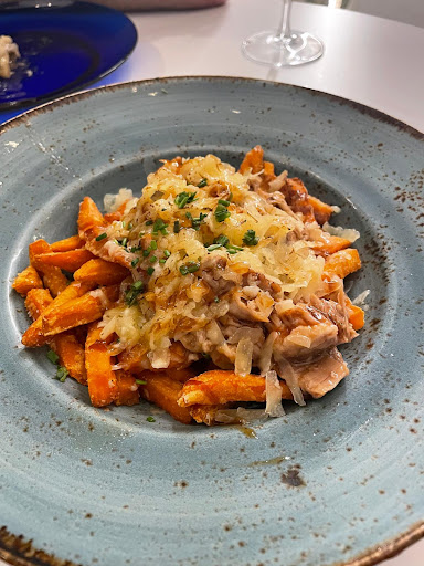 La comida está bien, aunque hubo un par de aspectos o detalles que hicieron que no fuera de 10. Probamos la croquetas de boletus, con buen sabor, pero un poco aceitosas y quizás un poco subidas de precio (4 croquetas - 10€). También comimos la gyozas de rabo de toro que son 100% recomendables, muy ricas y un sabor muy bueno. Probamos también las batatas con pulled pork, queso gratinado y salsa barbacoa, un buen plato calidad-precio, abundante cantidad y buen sabor del plato. Por último, probamos el bikini de carrilleras. El sabor de las carrilleras era muy muy bueno, el problema es que como se ve en la foto el pan estaba quemado por un lado y prácticamente destrozado por el otro.