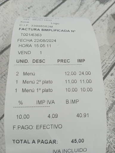 Read morePÉSIMA EXPERIENCIA!! La comida mala, la camarera y la dueña impresentables. Vamos 2 adultos y 2 adolescentes El menú del día por 12€. Y pregunto si los niños pueden compartir menú? Me dice que no , que sería medio menú para cada uno, cosa que no entiendo muy bien.Les saca un menú para los 2 y comparten. La sorpresa viene con la cuenta!! Me cobran 21€ por el menú "compartido" Le digo que me parece un robo, y sale la jefa e insiste en que es así. Le digo que pago los 3€ restantes y que me saque los 2 platos que faltan y se niega.Pido hoja de reclamaciones. Nos deja esperando a los postres 15 minutos. Filete con salsa de champis, duro como una zapatilla, lomo que no era lomo, y la tarta de queso es difícil hacerla tan tan mal. INCOMIBLE!! Pagamos el atraco y nos vamos La dueña nos sigue por la calle...