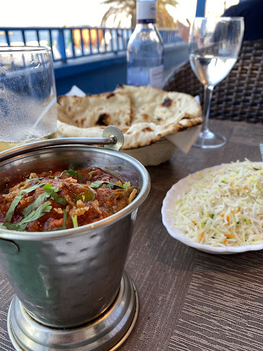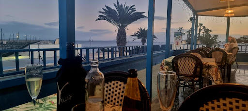 The Curry House Indian Restaurant is on the upper level of a collection of eateries in Punta Limones overlooking the Playa Blanca ferry port and the neighbouring island of Fuerteventura over the water.