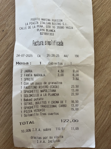 Read moreListed 3 times. Although we were on an, all inclusive holiday, this restaurant at Rubicon harbour was well worth paying for. Excellent food (would, if you order the Carbonara, add the garlic prawns from the starters menu to have along this main course meal.) 😋 My wife and I had 3 courses, Mixed Bruchette's, Carbonara (with the garlic prawns from starters menu), and a dessert (shared as we were both full). My wife had 2 cocktails 🍸 and a coke, I had 3 beers 🍻, and the bill came to €100 (£87). Unbelievable price for both quantity...