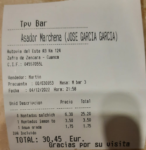 .................................................................. Ojo con este sitio! Relación calidad precio muy mala. Te engañan con la factura, Hemos pedido un bocadillo de chorizo para compartir y me han cobrado 2 montados sin avisarme antes, En fin, 3€ de robo adicionales. Nada recomendable, Lo único que se salva es el loro, Pero si quieres ver loros vete al zoo, te saldrá más barato. 2 ASADOR MARCHENA. (propietario) Hace 2 semanas Gracias por su opinión y valoración. Pidieron dos montados de chorizo y cuando ya estaban hechos dijeron que mejor un bocadillo( mirarían la carta y les supondría mucho la diferencia de montado 3,50 a bocadillo 4,50, 2,50€ de diferencia…) Les recomendamos que vean muy bien las cartas con una calculadora a mano para que no se lleven luego esos sustos, un saludo. Pdt: una entrada al zoo son unos 19€ … más luego lo que...