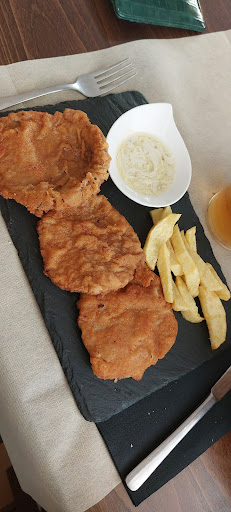 Todo buenísimo y con muy buena presentación!! El menú de fin de semana son 17 euros, con primero, segundo, postre y bebida (vino o agua). Hemos cogido 3 menús y un plato de escalopines de ternera con patatas con salsa roquefort(11€). De primeros: garbanzos con setas y pimientos del piquillo rellenos de bacalao. De segundos: osobuco a la milanesa con patatas y lenguado a la plancha con patatas panaderas.
