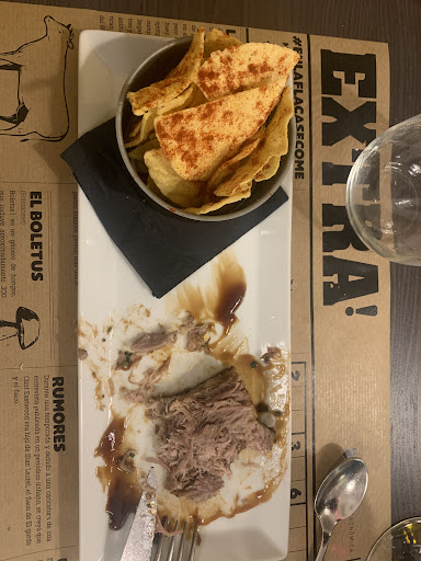 Aperitivo de la casa: consiste en un cuenquito para una cucharada de gulas cubiertas con mayonesa. Bacalao ahumado con vinagreta de naranja y pepinillos: los pepinillos era medio pepinillo cortado fino por todo el plato. Las láminas de bacalao venían también con brotes. El bacalao no sabía a nada y todo el conjunto era de un amargor insoportable (naranja, brotes y el poco pepinillo). Cigarrillos de pollo con verduras y salsa brava: cuatro tubitos de pasta filo frita, sin nada dentro, metidos en un tarro con salsa brava extrapicante. Taco de cochinita pibil con nachos: un taco medio vacío relleno de carne y rodajas de jalapeño, acompañado de seis nachos de bolsa (ni uno más) con salsa cheedar de bote encima. Estos tacos los tienen en la carta de pinchos a 3,80€ los dos tacos... Sumamente mediocre como plato principal. Tiramisú: una crema de queso insípida con cacao por encima. Se supone que el tiramisú lleva bizcocho de café, que es lo que le da el carácter... nada de nada, grasa pura sin sabor.
