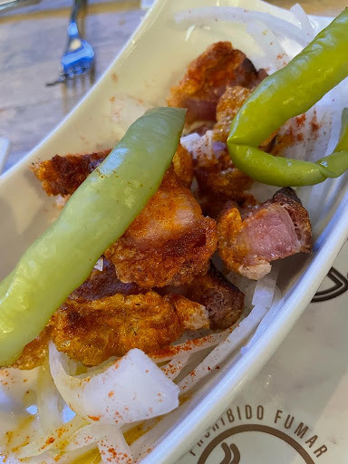 Aperitivo de la casa: consiste en un cuenquito para una cucharada de gulas cubiertas con mayonesa. Bacalao ahumado con vinagreta de naranja y pepinillos: los pepinillos era medio pepinillo cortado fino por todo el plato. Las láminas de bacalao venían también con brotes. El bacalao no sabía a nada y todo el conjunto era de un amargor insoportable (naranja, brotes y el poco pepinillo). Cigarrillos de pollo con verduras y salsa brava: cuatro tubitos de pasta filo frita, sin nada dentro, metidos en un tarro con salsa brava extrapicante. Taco de cochinita pibil con nachos: un taco medio vacío relleno de carne y rodajas de jalapeño, acompañado de seis nachos de bolsa (ni uno más) con salsa cheedar de bote encima. Estos tacos los tienen en la carta de pinchos a 3,80€ los dos tacos... Sumamente mediocre como plato principal. Tiramisú: una crema de queso insípida con cacao por encima. Se supone que el tiramisú lleva bizcocho de café, que es lo que le da el carácter... nada de nada, grasa pura sin sabor.