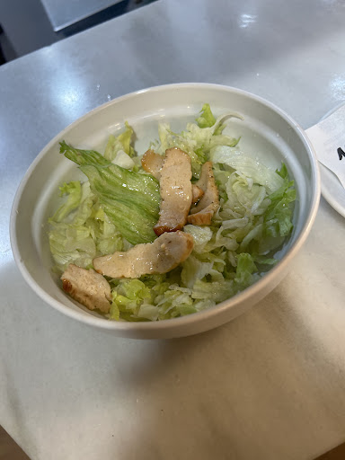 He optado por pedir una ensalada césar (obviamente sin queso, ni picatostes, ni salsa césar), quedándose únicamente con lechuga y pollo. Me han traído una ensalada con todo, así que me la han tenido que repetir. También he pedido unas olivas verdes sin hueso (que sale en la carta) y me las han dado con hueso. (Hoy no ha sido un día en el que el local estuviese lleno ni nada por el estilo, ya que de normal es una pasada la gente que hay.)