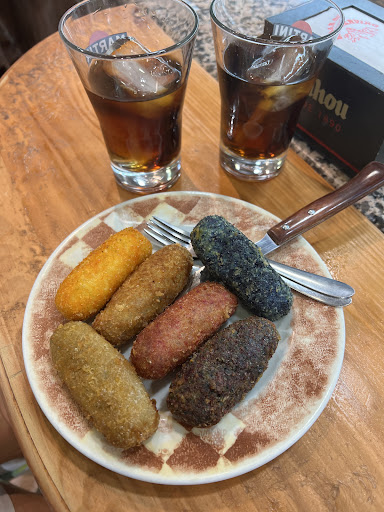 We took a detour here after visiting the Aljaferia, we were able to get a table easily at 8:30 on a weeknight. Everything tried was good, we started with the house vermouth and the surtido of croquets (all unique and tasty, goat cheese and the fig were probably our favorite), we also got the tomato salad with ventresca, the lagarto tenderloin (tender and came with a delicious sauce - I think based on sun dried tomato), and also had the ternasco/foie/quail egg tapa which was very flavorful. I would have liked to try some of the seafood but we couldn’t eat more. With two more glasses of wine, the total came to around 46€ and we...