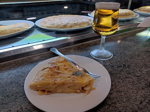 Bar perfecto para almorzar, tomar vermut o para echar un picoteo por las tardes. Especializado en tortillas, todos los días hay unas 10 o 12 tortillas de patata con otros ingredientes añadidos. Espectacular la barra que tiene llena de tortillas y algunos pinchos y tapas más. Hemos probado la de patata con bacalao y pimientos rojos y verdes, y la de patata rellena de jamón batido. Además había de patata rellena de longaniza batida, rellena de chorizo picante batido, etc.El servicio es rápido y amable y fuera tiene una terraza ideal...