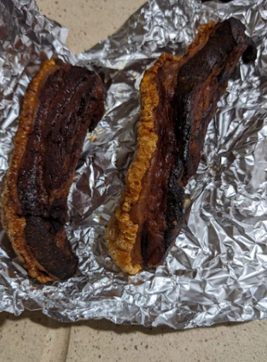 Pedí dos torreznos para llevar y ambos estaban calcinados (ver foto). Lógicamente no vi cuáles me servían ya que el camarero se fue a la cocina tras darle la comanda, si lo llego a ver no los hubiera pedido. Además, a principios de octubre 2023 costaban 4€ la unidad -que ya es un precio alto-, pero ayer 18 de noviembre de 2023 costaban 5,20€ la unidad.