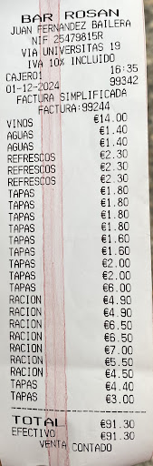 Read moreEn estos tiempos en los que en los bares ya no ponen ni música o ponen lo más genérico posible, en Rosan entras y puedes escuchar su personalidad. Ponen buena música. Con este extra de esfuerzo ya me es suficiente para volver. Pero también tienen una buena variedad de tapas inclusive 2 o 3 vegetarianas y se agradece mucho. Comimos setas con ajillo, una tapa que ya apenas se ve. Somos más de cervezas pero se ve que tienen vermut y vino, aunque siempre hay gente a todas horas bebiendo café. Hay clientes de todas las edades: estudiantes, familias, jubilados... Muy acogedor. El personal es muy profesional y el baño está súper limpio. Llevo yendo a este bar 30 años, aunque no voy con frecuencia, y creo que va para mejor. A un bloque del bar hay un parking gratis en la calle pero según a qué horas y qué...