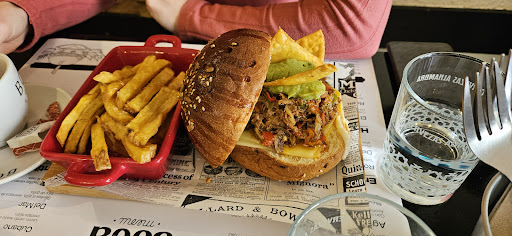 Nos decantamos por dos hamburguesas y un bocadillo viendo la pintaza que tenía en las fotos. Las hamburguesas estaban super sabrosas (200gr de carne) y el pan, aún no siendo el típico brioche que suele ponerse ahora, estaba suavecito y ligeramente tostado, me recordaba a los croissant por las láminas que dejaba. Las combinaciones que tienen son muy diferentes entre sí e incluso hay una que te ponen parte de un costillar. El bocadillo cubanito estaba también bueno. La combinación estaba bien realizada. Todo ello viene acompañado de una ración de patatas. No son las típicas fritas de bolsa, sino patatas cortadas en gajos grandes, incluyendo su peladura.