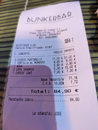 Read moreSay goodbye to your money! Horrible - a total bastardisation of Spanish food. Tortilla was undercooked, the size of a tapa and very expensive at €9. Very small portion of rice for €17 per person; tasteless. Cheesecake is not Spanish cheesecake; it's New York style and was bland. Sangria was not real sangria: it was a fizzy juice served with lemon and not orange. The staff were too embarrassed about the quality of the food to even ask us how it was. €90 in total: a total rip-off. As you can see from the other reviews, the same problems have persisted for two years and management don't care enough to...