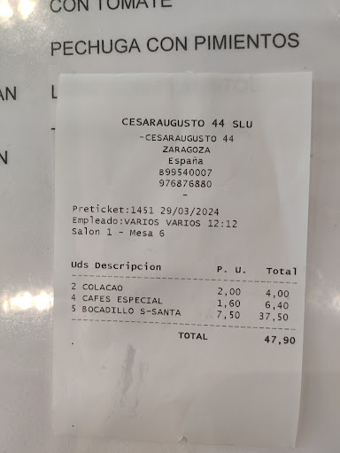 Read moreHe visto en las valoraciones que es habitual cobrar muy caro a la gente, debería haber mirado antes de entrar. Fui con la familia para tomar café y bocadillos. Los bocadillos están muy buenos pero en la carta no venían los precios. Un precio razonable de un bocadillo puede estar entre los cuatro o 5 euros, pero aquí me cobraron 7,50 un precio muy superior al mercado. Me pareció mal teniendo en cuenta de que no tenían los precios en la carta. Los bocadillos estaban muy buenos pero me sentí un pardillo pagando ese precio, uno igual en pleno centro no supera los 5 euros. Es verdad que no pregunté precio pero es obligación del establecimiento indicar los precios. En el ticket pone bocadillos s-santa, sospecho que es para cobrar más a los turistas que vienen por semana santa. El dueño me dice que el tamaño es superior al mercado y los bocadillos son muy grandes (en honor a la justicia es verdad), pero igual de grande que otros más baratos. Por ese precio me lo hubiera pensado antes de pedirlo ¡En un desayuno!. No saqué fotos del bocadillo porque ya me los había comido. Hay que apoyar a las empresas y empresarios, pero también explicarles que eso no se puede hacer, perjudica a nuestra marca España. Me duele en el alma poner una reclamación. No la habría puesto si hubiera admitido su error y hubiera ofrecido algún tipo de compensación y/o rectificación. Si quiere poner un bocadillo a 200€ es su decisión y la del cliente de pagarlo, pero que lo ponga...