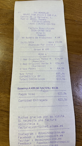 Read moreUn trato super racista , la encargada de ese local tiene muy mala educación trata ah sus clientes con el ego hasta el mas halla se piensa que manda ella y los que pagamos tenemos derecho aguantarla !! fuimos 8 personas para comer 2 de ellos niños de 3 y 6 años donde a cualquier niño se le puede caer un trozo obviamente ese trozo se tirara ala basura ella nos dijo que los estábamos escondiendo por querer tirar ese trozo y que no , nos iba a servir mas por q aun teníamos 3 trozos sin comer cuando ala mesa de alado le estaban sirviendo y daba igual que tuvieran pizza todavía en la mesa …. se nos callo coca cola en el suelo tuvimos que llamar 3 veces y quejarnos sin parar para que nos prestaran la fregona o salieran a recogerlo Una de las trabajadoras soltó un comentario donde dijo “ ya están mirando haber lo que van a robar “ todo el rato riéndose mientras servían a mas mesas a nosotros nos dejaron sin nada habiendo pagado todo es una vergüenza diciéndonos que nos estaba vigilando el racismo es una de las cosas que no se permite en esta vida tenemos derecho al igual que todos , TODOS SOMOS HUMANOS … es uno de los peores domino's que eh ido en toda mi vida creo que el derecho es mutuo donde debes tener educación cuando entras a un lugar a comer , para ser tratada con respeto y educación , la gente que trabaja allí no tienen modales unos sin vergüenzas de mucho cuidado. Te sirven cuando quieren te ponen mala cara esto fue ayer sobre las 10 de la noche habíamos 3 mesas y 2 quejándose una vergüenza que tengamos que soportar estas situaciones y si no les apetece trabajar pues no trabajen y mucho menos cara al publico merecemos respeto...