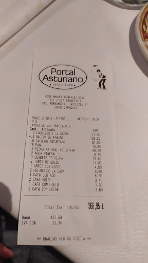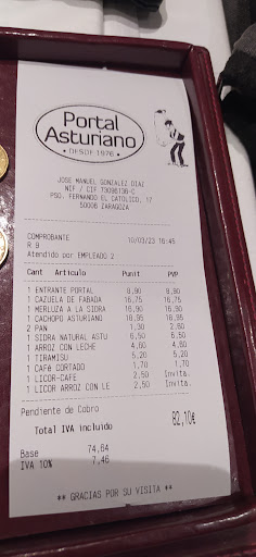 Read moreSe podría llamar Portal Asturiano con precios y cantidades para "ignorantes Zaragozanos". Antes de nada, recalcar que todo lo que hemos comido estaba muy rico. Pero no me sorprende leer por ahí abajo comentarios de algún asturiano indignado con los precios y las cantidades jajaja Detalles como cobrarte 8 € por 6 panecillos pequeños (la de pan que se puede comprar con 8 €, y soy de esos que sigue sin soportar que, además, le racaneen con el pan), la botella de la clásica sidra Trabanco a 6,50 € (hace unos meses en Asturias la estaba pagando a entre 3 y 4 €), el tamaño de la tarta de queso puede ser la tercera parte de lo que te pueden poner en cualquier sitio de Asturias. Y por supuesto el tamaño del cachopo a 19 € (el dueño amablemente te explica que es el mismo tamaño individual que ponían hace 50 años (pero nos guste o no, los tiempos cambian y como le pongas ese cachopo a un asturiano, se pensará que hay una cámara oculta, ya que allí no llegaría a ser ni un cachopín). Lo dicho, sabor asturiano a precio de "conformadicos zaragozanos" (a tenor de sus...