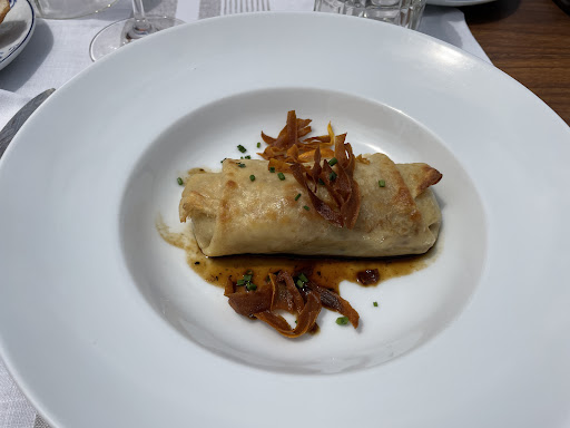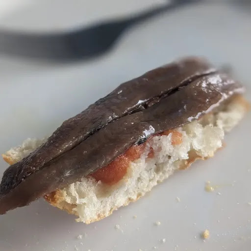 Cecina de ternera La Finca con almendra tostada y AOVE. Gran producto. Anchoas del Cantábrico sobre pan de cristal con tomate. De nuevo productazo. Ensaladilla casera con langostinos, aceite de arbequina y huevo frito campero. Muy rica. El huevo frito es un gran añadido a la ensaladilla. Kokotxas de bacalao al pil pil. La salsa era espectacular. Tiradito de txuleta a la brasa. Producto, otra vez.