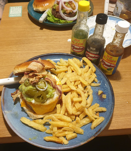 La comida estaba buena. Tal vez algunas raciones eran un poco justas por persona, como por ejemplo la ración de pan de pita con preparado de tzatziki (en una de las fotos), que literalmente me sirvieron dos pequeños medallones de pan de pita para comer un bol bien lleno de tzatziki... :-S Por otro lado, las hamburguesas se sirven con una ingente cantidad de patatas (en otra de las fotos), que equilibran un poco la anterior carencia. Recomiendo tanto la hamburguesa Jalapeña (picante) como la Jalisca (no picante). Para beber (y aquí viene la mejor parte 😋), la michelada, que me encanta. Esto es cerveza con jugo de limón, sal, algo de tabasco (o Lea&Perrins), copos de chile espolvoreado por el borde del vaso y hielo. Puedes elegir la cerveza que desees de las que se ofrecen en la carta del establecimiento, de la cual recomiendo la Modelo Especial. Es un cóctel muy refrescante.