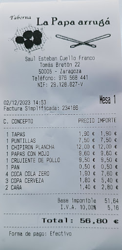 Hoy día 12 de julio me tocó el reconocimiento médico y acudí con un compañero y después del reconocimiento médico me dijo el compañero ahora almorzar y acudimos al bar la papa arruga.....yo me pedi huesos fritos con beicon y mi conpi se pidió una papa rellena y unos huevos fritos solo con patatas y para beber agua de litro y medio bueno y toco la hora de pagar a mi compi le cobro 5.50 y ami por los huevos con beicon y el agua 650 no me quede satisfecho puesto que el agua me cobro 2 euros con 50 me a parecido un verdadero robo ......y esa misma botella en el sympli de enfrente me costó 0.44 me parece que la diferencia es bastante notable....para no volver...