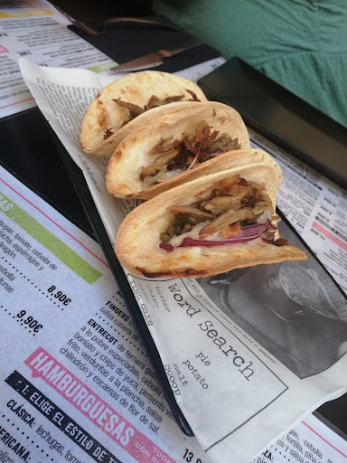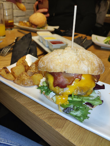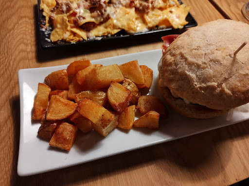 En cuánto a la comida, bien, correcta sin pretensiones con algún matiz a destacar. Más de 1 hora en sacar los nachos maños con longaniza de Aragón y luego 15 minutos más en sacar los fingers de pollo. En los nachos (11'9€) eché en falta algo de cremosidad pero la longaniza le daba el toque sabroso. Los fingers (11'9€) estaban ricos y la salsa de queso que acompañaba también. Además su presentación era divertida. Pedimos la hamburguesa quesera (12'9€), casualmente el pan de todos los que ofrecen hoy no lo tenían disponible, una pena. Hicimos hincapié en el punto de la carne, hamburguesa muy poco hecha, salió pasada. La combinación de sabores es correcta, potente sabor a queso y los pepinillos le dan el toque fresco. Venía con patatas y 3 salsas en el centro para acompañar que estaban muy buenas. Nos quedamos con ganas de probar la tarta de queso porque tenía muy buena pinta pero el miedo a que tardara mucho más tiempo nos venció.