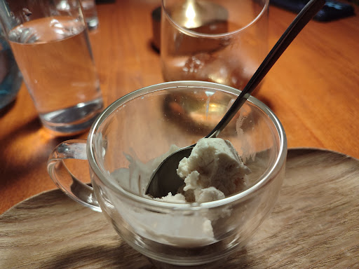 Yo no quise arriesgar y miré los ingredientes. Así que me decanté por uno llamado "prisa y pausa" y mi novia eligió uno cuyo nombre no recuerdo pero que llevaba piña colada. El mío estaba riquísimo, iba en un vaso giratorio y llevaba Pedro Ximénez, un brandy ahumado, tabaco y no sé qué más licores que le daban un toque como de madera y humo que estaba buenísimo. Era como tomarte un brandy de sobremesa, pero con toque ahumado y una textura cremosa que te recubría todo el paladar. Además iba acompañado de una bola de helado de trenza de Almudévar. El cóctel de mi novia lo probé y también estaba muy bueno, era como una piña colada pero más intensa e iba acompañada de un merengue de coco.