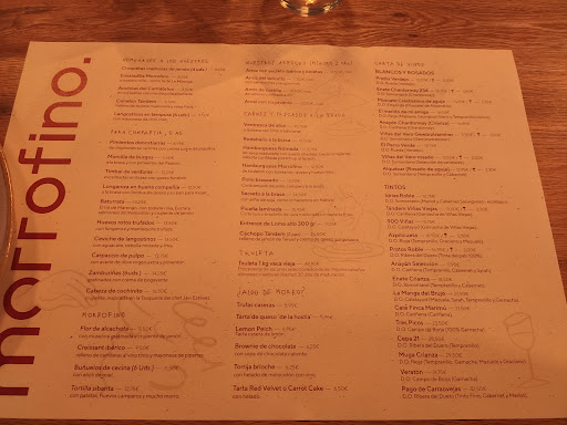 Read moreEstuve cenando en Morrofino el pasado 9 de mayo de 2025, y nos ofrecieron un menú cerrado por 29,95 € por persona, lo cual ya fue un buen comienzo. La propuesta gastronómica me pareció fenomenal: empezamos con la elección de tres platos al centro para compartir, seguidos de un plato principal individual para cada uno y un postre.