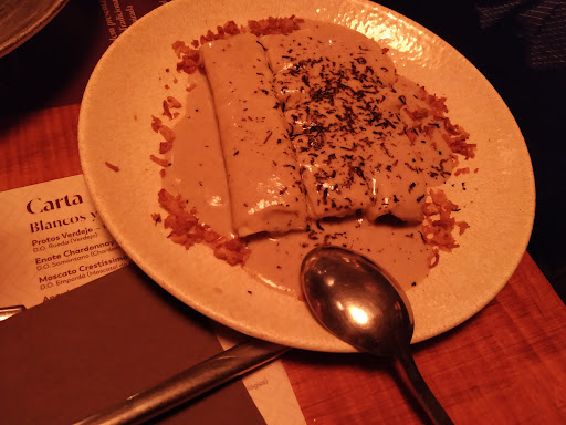 Respecto a la comida los dos primeros platos muy peculiares en sabor. El canelon tenía salsa de boletus, muy suave, casi parecía crema, en conjunto con lo demás espectacular. Los chipirones súper recomendados, en su punto, un sabor increíble con las verduras con las que los sirven, sinceramente el mejor plato.