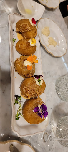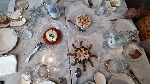 En la entrada, ya sorprenden las grandes cristaleras que permiten la entrada de luz natural por todo el local, dando un aspecto muy europeo. La decoración mezcla texturas y materiales para crear una atmósfera confortable. Desde el siempre sofisticado terciopelo, a los materiales naturales que se utilizan en lámparas o sillas y que sirven para conectar con el producto que se sirve en las mesas. Desde que entras la atención te hace sentir importante, en la mesa los consejos gastronómicos hacen facil tu elección y durante la velada se preocupan que estés a gusto, como en casa. Felicidades, en pocos sitios es así. Felicidades tb x la valentía de iniciar tan sofisticado proyecto en tiempos de pandemia, seguro que será un rotundo éxito. Esta pareja de jovenes emprendedores y su equipo lo han perseguido. No obstante ella, Leticia proviene de generaciones hosteleras( descendiente Casa Lac). En cuanto a la comida, estuvimos cenando cuatro personas y pedimos seis raciones con postre (no os perdais la torrija), boquerones, patata con papada y huevo, wok asiático, albondigas merluza, buñuelos bacalao y canelones loganiza y foie, todo sin excepción de 10. Así como los tiempos entre platos bien acomodados. Y para finalizar la factura con 2 botellas de Mara blanco y gin tonic y cafes 172 € . Precio a la medida de la calidad de los productos y cocina. Por poner un pero, deberán corregir la reverberación del sonido en sala, es un poco molesto. No obstante no le resta para nada de mi valoración 5 estrellas. No os lo perdáis, yo volveré sin duda. Ya lo tengo en mi agenda como restaurante de cabecera. Mucha suerte en este nuevo...