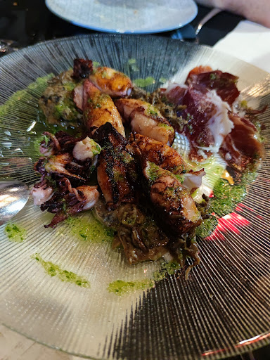 Probamos el risotto de trufas con boletus (un acierto total), los chipirones con jamón muy ricos, el tartar de atún bastante contundente (sorprende llevando en su base una capa de arroz blanco de 1 cm de grosor que al envolverlo todo junto se hace un plato de peso y calidad -echaría en falta cierta textura más suave, el arroz lo deja algo "seco/sin dinamismo" cuando un tartar tiende a ser más "suelto"-) y por último nombraría el carpacho de pulpo con Parmentier y helado de remolacha (una opción muy arriesgada en la que triunfa el pulpo laminado finamente sin perder textura, unido al Parmentier que combina muy bien pero con el helado de remolacha en forma de bola abundante no termina de "ligar", matando bastante el sabor del pulpo.. más si cabe cuando el propio pulpo va muy sutilmente aliñado con pimentón, aceite y poca sal, que al comer en conjunto con el helado.. -sabor fuerte- pierde toda la gracia).