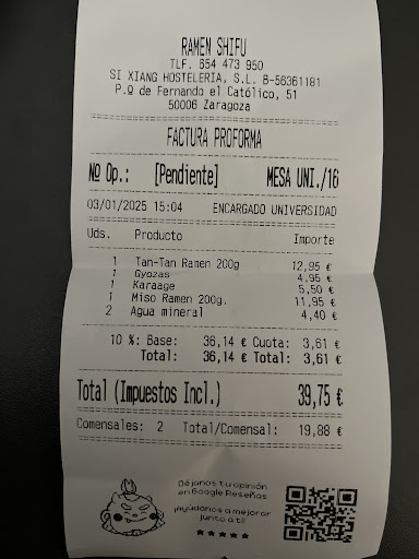Una experiencia que podría haber estado mejor. Me encanta la cadena de Ramen Shifu. Sus otros restaurantes los he disfrutado mucho, tienen buena comida. Pero en general creo que están algo sobrevalorados. Hablaré sobre este en particular, el nuevo de la cadena en Zaragoza. Siguen siendo los mismos platos y la misma manera de cocinar, pero de momento, está fallando en muchos puntos. Te sientan enseguida, pero tardan en atenderte. Las mesas no están preparadas, en la nuestra se habían acabado las servilletas y no estaban repuestas. En la de al lado también. Además pedimos cambio de mesa porque estábamos al lado de una lámpara de techo que era un imán de mosquitos y nos estaban acribillando. Ninguna estaba preparada para cenar. Tardaron tanto en atendee, como en tomar comanda, como en cocinar y en traer cosas que íbamos pidiendo. Teníamos que pedir varias veces. Eso sí, el amable camarero de pelo largo se tomó su tiempo en explicar los postres sonrientemente a una chica muy mona mientras intentaba ligarsela. Para mi no supondría un problema eso si estaba más que claro que les FALTABA personal y que no llegaban a todo. Probablemente sea culpa de los dueños, o no, quién sabe, pero estaba claro que los demás pobres camareros no llegaban a todo y menos aquel dedicado camareros, todos los demás hacían lo que podían, se podía ver correr a casi todos.