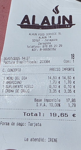 Read morePara ser bar de polígono veo excesivo cobrar por el hielo. Me paso toda la semana fuera de casa comiendo en bares de polígonos y es la primera vez que me ocurre. La comida buena, poco abundante pero buen sabor y buena calidad. Pensaré un par de veces recomendar este lugar para comer e incluso para volver (por el trato en barra). Sobre la camarera que me atendió en la barra para pedir el café con hielo y el tubo de crema de orujo, para trabajar en hostelería hay que ser un poco profesional. Cuando te pregunte alguien a que hora tenéis el cierre, no decirle que a las 18:00 cerráis, "que si quiero tomar café que venga a las 17:15 que si no me pongo nerviosa". Una mención a cocina: aunque estéis ahí dentro, sin vosotros el local no sería nada. La atención en mesa ha sido cordial...