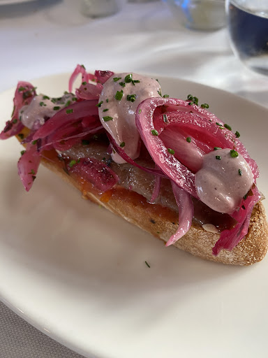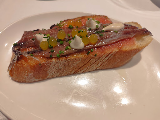 1️⃣ Sardina ahumada en pan tostado, mayonesa de ajo negro, cebolla encurtida y mayonesa de aceituna negra, muy rica y que conquistó al heredero rápidamente.
