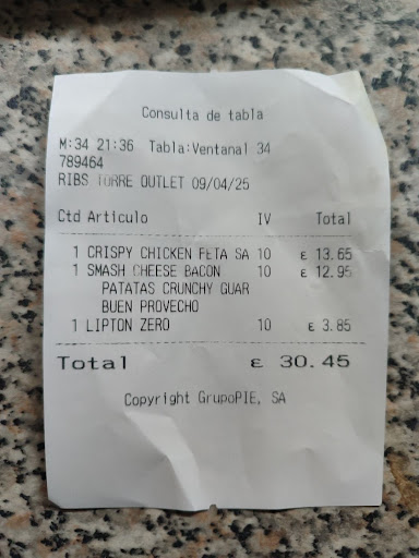 Read moreEl pasado 9 de abril aprovechamos con mi novia para ir a Torre Outlet para disfrutar de una buena cena. Entramos a las 21h al restaurante. Pedimos lo más rápido que pudimos: una 4 cheese burguer Smash, una Sweet Mexican Salad y un aquarade de naranja.Señalamos en la carta dichos platos para que no hubiese confusión. Hasta ahí, todo correcto. Para empezar el show de errores, tras 5 min volvió la camarera comentándonos que no tenían aquarade, terminamos pidiendo lipton. Después de 30 min de espera y observando que solo había dos mesas en el restaurante en ese momento, decidimos pedirlo para llevar. Finalmente, las 21:35h nos sacan nuestro pedido en bolsa y nos cobran. Salimos del restaurante y al revisar la bolsa no había cubiertos. Fuimos a solicitarlos para la ensalada. Nos dijeron que no tenían y nos dieron a cambio una servilletas, las cuales no habían incluido anteriormente. Al comenzar a comer, nos dimos cuenta de que ni la hamburguesa ni la ensalada, eran las que habíamos pedido. Con dicha sorpresa, revisamos el ticket, en el cual se nos había cobrado una Smash cheese bacon y una crispy chicken feta salad (que, tras revisarlo en la web, ni si quiera tenia los ingredientes que se mencionan en el menú como se puede observar en la foto, bien pobre que es por 14€ de ensalada), es decir, en lo único que coincidían era en que la hamburguesa era Smash y la ensalada la palabra salad. Por último, hicimos la queja formal esa misma noche por la app de ribs, y tras varios días de espera, nos responden con un email de palabras vacías sin solución alguna a la decepción de cena que nos llevamos. Sin duda, nos deja con cero ganas de volver. Adjuntamos foto del ticket, de la comida que realmente pedimos y queríamos comer, de lo que nos dieron y de la "solución" que nos ofrecieron desde "atención al cliente"....