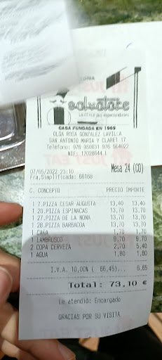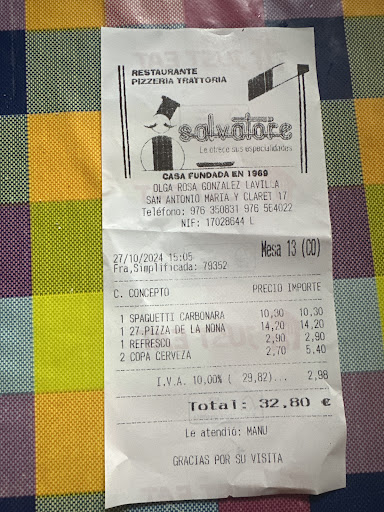 Read moreHa perdido mucho. Salvatore ha sido mi restaurante favorito durante muchos años, pedíamos entre 1 y 4 veces al mes y era increible, la masa muy buena y la salsa boloñesa... un espectáculo. Bueno, lo primero que perdieron fue la calidad de boloñesa, no se si cambiaron el cocinero pero paso de ser espectacular a una del montón cargada de sal y problablemente glutamato monosodico, poco después acabaron con la masa... paso de ser esponjosa y crujiente a gomosa (hasts la del telepi la mejoraba) y ahora mismo podría decir que solo se salvan las lasañas napolitana y de berengena, tampoco tan buenas como antes (demasiada sal otra vez y sabor como con potenciadores de sabor que no deberían estar ahi, lo espectacular es como conseguían los sabores con la materia prima y su cocina... añadir potenciadores o sal por un tubo es una "trampa" que vuelve la comida mediocre. Por supuesto ahora mismo ya no lo recomiendo, una pena por lo que han sido. Pongo 2 estrellas por la nostalgia y porque el trato al cliente sigue siendo igual de bueno que antes, aunque un poco mas lento. Si vais pedir las lasañas, es de lo mejor que tienen en...