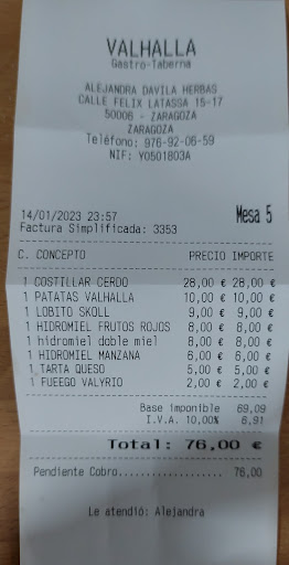 Read moreEl local es pequeño y acogedor, el trato de la camarera fue excelente, explicándonos la bebida, cada plato y aconsejandonos lo que podiamos pedir en función de nuestros gustos y de la cantidad. Pedimos dos entrantes para compartir, las PATATAS VALHALLA que son patatas gajo con carne de cerdo mechada, salsa de queso cheddar fundida y un toque fresco de pico de gallo, están de locura y un LOBITO SKOLL, que es un perrito caliente con salsa BBQ al Jack Daniel's, maíz dulce y queso rayado, quizá lo más flojo de la cena. Como plato fuerte pedimos un cosillar de cerdo a compartir, viene acompañado de patatas y con salsa BBQ al Jack Daniel's, estaba increíble, la carne se separaba del hueso, tierna y sabrosa, increíble. Para beber pedimos HIDROMIEL, de FRUTOS ROJOS, que se asemejaba (a ver, entiendanme) levemente a un rosado espumoso, una de DOBLE MIEL, la cual tenía un gusto a miel muy marcado, es un sabor peculiar y una de MANZANA, muy fresca, parecida a la sidra. Destacar que te ofrecen beberla obviamente en copa o te dan la opción de hacerlo en cuerno, tiene su punto, lo que se echa de menos es algún artilugio tipo soporte para poder sujetar el cuerno vertical y no tener que andar echándote la cantidad que vayas a beber en cada momento (es una sugerencia para los responsables del negocio). Terminamos con una TARTA DE QUESO de postre, que viene acompañada de un sirope de chocolate blanco y de dulce de leche, estaba muy buena también y un chupito de FUEGO VALYRIO, de un color verde sorprendente pero que engaña, pues piensas que va a tener un sabor y un aroma muy marcado a hierbas y contrariamente huele y sabe a canela. Los precios son muy razonables, por la cantidad que ponen y lo bueno que está, se puede decir que merece mucho la pena, si bien la hidromiel si nos pareció un poco fuera de precio (8 € cada botella de 1/3 y 5 € la de manzana que era de 1/5). En cualquier caso y como resumen, sitio muy recomendable,...