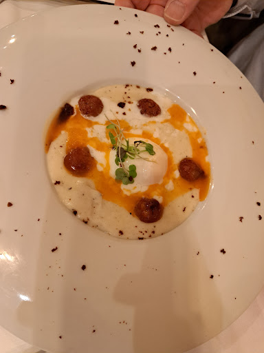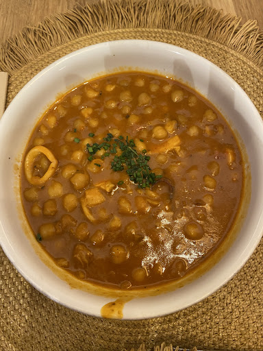 El menú de fin de semana es muy variado , elaborado y la presentaciones son excelentes. Entre otros platos pedimos de primero: canelón de merluza, ensaladilla de atún rojo con salsa mayo kimchi y totopos de maiz , arroz con bogavante, mi pareja unas alcachofas guisadas con jamón ibérico en parmentier de trufa y foie, que estaban deliciosas y yo los garbanzos con pulpo y chipirones que estaban riquísimos