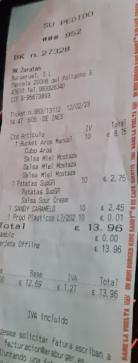 Read moreHoy he ido al burguer y todo mal. No me ha dado el ticket para saber cuánto cuesta cada cosa (ya que lo pedí por ventanilla para llevar y no sabía ni cuánto era cada cosa) porque lo tira. Hago mis cuentas un poco a lo alto y sabiendo que tengo el descuento por familia numerosa no me cuadraban las cuentas. Voy a preguntar a la chica cuento es cada cosa porque me salía de más que he pagado. Lo calculamos y efectivamente no me había hecho el descuento de familia numerosa, ahora llega lo mejor, sabiendo que no me ha hecho el descuento, me dice que son 2€ menos solo por familia numerosa, y que si los quiero, que madre mía por 2€… No me parece bien el trato, haciéndome esperar por “atender” que parecía como que me daba largas para que esté ahí esperando. Además que si hubiese hecho bien su trabajo yo no tendría que estar ahí reclamando 2€, que igual ella lo veía como si fuera poco, pero esos 2€ a mi nadie me los ha regalado. Me he informado y he visto que cobran de media los trabajadores del burguer 7€ brutos, me gustaría que ella trabajase una hora y que la paguen 5€, haber si no reclama los 2€ y no dice “madre mía por 2€…” Mucha prepotencia señorita N**kon… A todo esto, @burguerking no se que diferencia hay de un Oreo que lo ponen como complemento de la comida o como separado de la comida? Uno está más bueno que el otro? Porque como complemento vale 1,90€ pero por separado 3,25€… no se vamos, igual unos está más delicioso...
