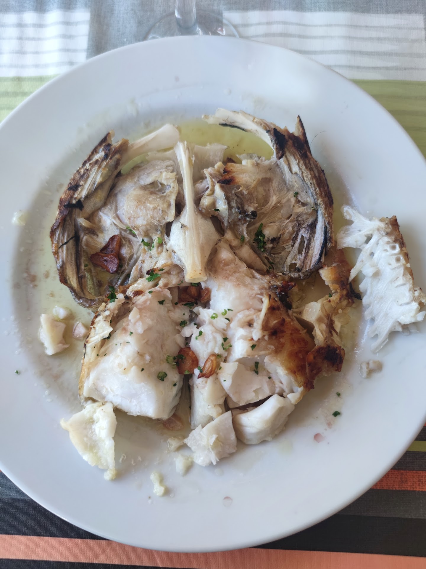 No sé lo que pedimos pero según pedíamos nos decían "pues te voy a traer otra cosa" lo que nos hacía mucha gracia con el chico que nos atendía que era un tío encantador. Nos sacaron un primer plato con un huevo de caserío adornado de marzuelos cogidos por ellos mismos que estaba delicioso a morir. Luego nos pusieron un plato de lubina salvaje divina de la muerte y unas kokotxas de bacalao frescas como nunca había probado nada igual (y de pescado mi aita sabe un montón porque es medio pescadero).