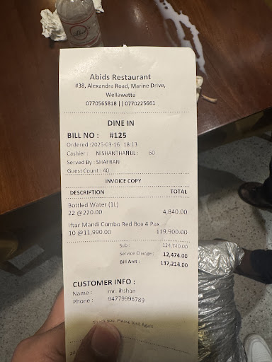 Read moreThis place is a must for those who love authentic Arabic and Indian food!! đThe food was fantastic! Absolutely loved their super flavorful Mutton Mandi, their amazing and rich Haleem, Chicken Biryani (a proper yummy Chennai style Biriyani with Brinjal gravy & Raita), their creamy Mexican Plate Shawarma, Shawarma Roll, Murgh Malai Kebab and Bread Halwa!! They were all too good!! The Mandi rice alone had so much aroma and flavor and the Mutton in the Mandi Rice was extremely juicy and flavorful!! As someone who usually likes Beef and doesnât eat Mutton i was pretty hesitant to try it! But their Mutton changed my whole opinion! I tried it for the first time and I must say that their Mutton definitely tasted better than Beef!! đ Their service was on point too! Their staff were all very friendly, welcoming and were quick with their service đ Especially their employee Mr. Arshad did a fantastic job!!! đ He has always made it an overall great experience at Abidâs by helping me out so much with all my queries and always made sure everything was done to perfection!! He was very kind, helpful, friendly and kept making sure that we got everything we wanted from the start till the end!! đ Also, their employee Mr. Aflan was really helpful and did a great service making sure we got all our food on time and helped us so much with getting things to our table đ He too made sure to check on us throughout!! It was an overall great...