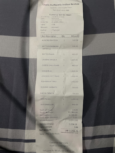 Received the worst and very much disgusted service ever in my life from Chola Authentic Indian Restaurant - One Galle Face . Had gone with my wife and 3 year old daughter. There was a bit of quarrel while entering the place at about 9 with their not so friendly staff named Uzman. Boy did he make sure we had a great time. From his sarcastic greeting, the time he got to take the order (most of the items was not available when I asked. The I ordered which I made also never came) and how he made sure that all the other staff also ignore us. His accomplice was another very cold hearted girl named Sumaiya who was roaming around (said she didn't see us when asked). We placed order around 9. 10. A person came to the table asking if that'd be all around 9.50 pm. Where we only got 2 water bottles, a mango lassie (not so worthy of mentioning) and a mango juice (why did we even order it?). They didn't want me to pay for items I got as the others never came. As I was not there for free food I insisted they bill me and made the payment + service charge for a service I never got. The craziest part happened after I told the boy that none of my orders came another girl came to apologizing saying she didn't know how they missed the order and she will correct it and will arrange it within ANOTHER 10 MINUTES. All this time my little girl was waiting for the food only having some sips of water. I can't believe how inhumane people can be even after seeing a child and willingly making her starve. I called the CHOLA Authentic Indian Restaurant main branch hoping they would at least take notice of the incident. To (not so much of) my surprise the person who attended the phone asked me to complaint to the particular branch as they are not from the same location. All the staff were already aware and how can I make a complaint when I know it will...