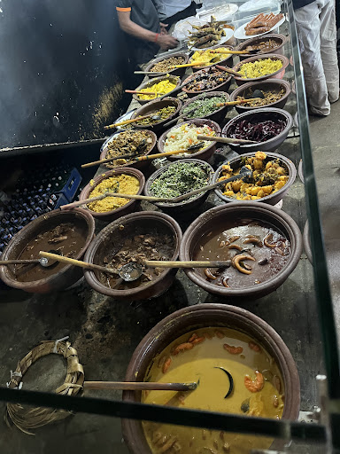 A variety of meats (mutton, chicken, fish, beef) & curries over a bed of rice, accompanied by numerous side dish options that range from sweet to spicy and everything in between. Tell them what you want when it's your turn to order and pay at the end.