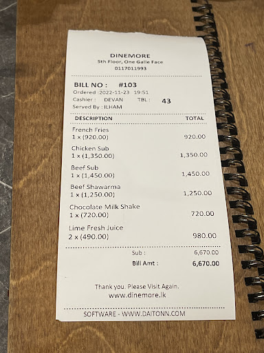 3.Food - Once again I came to dinemore to fulfill my past experience with dinemore but unfortunately food is not up to the standards, sandwich bread overcooked dry Meat is very cold French fried soggy very little ( 7-8 fries ) Seems like old food heated up but didn’t heat properly Over tall cold less tasty food
