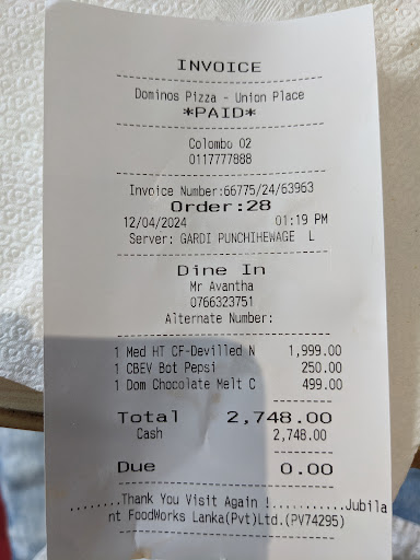 Read moreBy far the worst recurring fast food experience! Ordered twice through the Dominos website and experienced exponential delays in delivery (over three and a half hours in October 2022 and over 1 and a half hours last week), best part being the so called hotline not being reachable to even inquire about the order and the site indicating “pizza is being baked” throughout with no clear tracking available. Although I would have cut some slack for the delays, our worst experience was last week when I received two stone cold large pizzas with no seasoning, 1 and a half hours after ordering, despite the 30 minute promise of delivery, and tasting a spoilt pizza dough! Complained over the weekend and the generous call center associate decided to lecture on mozzarella cheese tasting different to other cheese without promptly attending to my complain and by least showing some degree of concern over a food poisoning compliant (honestly though, I can tell the difference between rotten pizza dough and mozzarella). Received two calls from the outlet who offered the same order to be delivered to my residence as a complimentary gesture but i politely declined given that I’d never order or taste a pizza from Dominos Sri Lanka again! Such a shame being a part of an international fast food chain and to whoever who’s reading this space for honest reviews, there are plenty of other restaurants offering amazing pizza at the same price so save the trouble and Google...