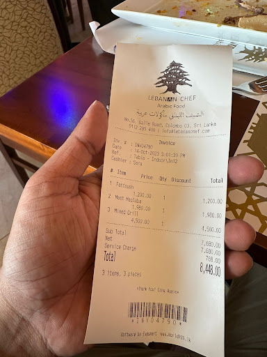 Read moreWent there for a late lunch around 2.30pm with a friend and there was a massive load of people waiting to be seated. Given the restaurant is new I’d give them that but the management took a blind eye to the waiting customers as no one attended to them nether stated there is a waiting time when you walk in. There were people just standing near the people who were dining like a busy food court to grab the seat the moment they are done with their meal. We tried approaching staff to know if the place is full, but non seem to care. Just that only one steward was nice to admit the restaurant is full and try the patio. The patio area was very nice but it was flooded due to rain and no one troubled themselves to clean it up and arrange for the waiting customers. Let alone there was left over food that lying on the tables which people had finished dining. Apparently, they have a VIP area that is only reserved and the crowds waiting cannot access that. The stewards only attended to a designated area they were assigned and declined to attend to any guests who were out of their scope. Had to go behind the staff to order and hardly anyone was bothered. We had to go to the counter and get us our menu and go to the manager and asked to take the order. Once you get to the point of ordering, half the things in the menu are not available. We only tried rice given we love the Arabian rice dishes. So we ordered a chicken Kabsa which was LKR 1800 and a mutton Yemeni Mandi of LKR 2500 with two Pepsi. A Pepsi costs LKR 700 for a glass bottle. The order was brought in without the drinks and once the food was served they remembered the cutlery. The cutlery that was provided to us was picked up from here and there and literally they gave only one fork for two of us. Finally, when we started to dig into the food we realized that both the rice types was the same. We were seated right in front of the kitchen in the high table and it was noticed that they served one type of rice to all of the rice dishes ordered during our stay in the restaurant. But definitely it gave all the fancy names of the Arabian rice dishes. Further, the rice we ordered was not even close to an authentic Mandi or a Kabsa severed in the Arabian region. Simply, a local small joint does mandi rice better than these Lebanese cooks. The portions are quite big with a generous portion of meat. However, the overall rice dishes took was an utter flop. We had to ask a separate steward for our drinks and wait and wait forever for the bill. Finally similar to finding someone to order we had to get up and go and ask the manger for the bill. They were struggling to find our order where the cashier claimed there was no order recorded neither our table. Finally, the manager went through what he jot down to finalize the bill. The food served is not worth their pricing and tastes way below ordinary. The management is not organized and customer friendly. The service is beyond poor. Definitely I’m not gonna visit this place for any Arabian rice and not...