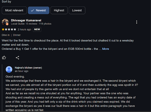 Thank you for your response, but we need to clarify the facts, especially after being accused publicly of 'playing a game’, which is completely untrue and highly unprofessional. Let’s start with the first biryani: I returned half of it along with the chicken and egg after finding a hair at the bottom of the pot, an unacceptable hygiene issue. You replaced it, but the second portion was clearly leftover, a very small quantity with no chicken or egg. When we asked about it, we were given a dry piece of fried chicken and a fried egg (not how biryani is normally served). That immediately raised concerns. We became suspicious when the boiled egg was fried, which is unnecessary in a biryani, so we checked its smell. Both the egg white and yolk smelled rotten. Your waiter noticed this as we were checking, and we informed him right away. He went and told the older lady who had been seated from the time we arrived. She immediately began shouting at us, saying we were creating drama, telling us to pay and leave, and even calling us beggars and robbers, all in front of another customer. That kind of disrespect is unacceptable. Initially, my partner told me to just pay and leave a review, but when we were treated like this despite your mistakes, we simply couldn't accept it. After this scene, we randomly checked the expiry date on the EGB bottle, by that point, we had drunk more than half of it and saw it had expired in January 2025. When we raised it, your staff took the bottle away and never returned it. Then, that same lady told us she would call the police, and we agreed and waited there for her to do so. But instead, a young man came in much later, with no idea what had happened, and without listening to us, he began blaming us for not checking the expiry date on the soft drink. Not once did he acknowledge that you should not be storing or serving expired drinks in the first place. So, your logic is that it's okay to keep expired drinks and serve them to customers, and it becomes the customer's fault if they don’t check? You now claim the drink wasn’t expired. If that was true, you could have shown us proof then and there. Why wait until after we left and posted a review? And for someone who says they ‘don’t entertain games’, you had every opportunity to prove your point when we were in front of you. If you are so confident in your innocence, you could’ve called the police, as you threatened. You claim we ate most of the second biriyani, that’s not true. We returned half the first one and barely touched the second because it was inedible. And now, in a public reply, you're accusing us of playing games. If you truly believe that, why didn’t you do anything while we were there? You say you treated us well if that’s the case, then show the CCTV footage. It will clearly show who started shouting first and how we were spoken to. Whenever we see your restaurant, it’s almost always empty. Now we understand why. If you're serving spoiled food and expired drinks, naturally, people will stop coming. It’s not just about the food; it’s about how you treat your customers. If fewer customers are walking in, that doesn’t give you the right to offload old food on the few who do. And if you're still confident that we were in the wrong, I'm more than willing to come with you to the police anytime and clarify everything because we have nothing to hide. We may not have recorded the incident, but that doesn’t make it any less real. If anything, the only thing we regret is not calling the police ourselves. One final note: the food industry is sensitive. You're dealing with people’s health. If you can’t maintain basic standards or treat customers with respect, maybe it’s time to consider a different line of work. Instead of wasting your time blaming us, invest that time in fixing your service and improving...