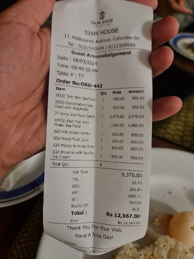 My recent visit to Siam House Restaurant in Colombo left me with mixed impressions. While the menu prices seemed a tad high, the inclusion of numerous taxes and fees on the bill added an unexpected layer of complexity. The presentation of the dishes, notably my tom yum soup, was disappointing, featuring unsightly marks outside the bowl, indicating a lack of attention to detail.