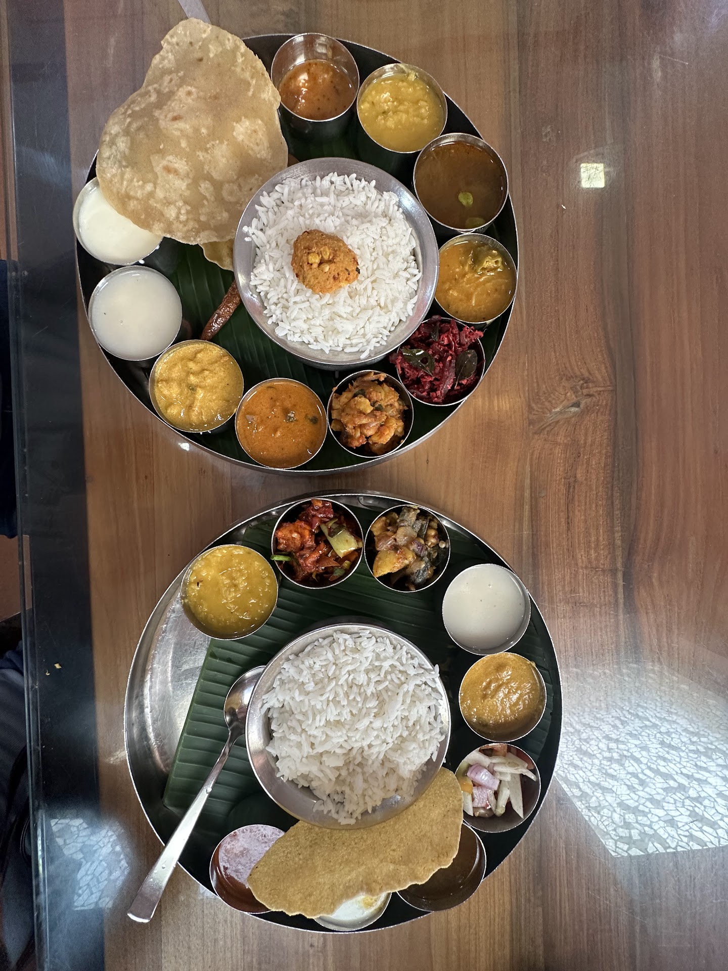 The North Indian Thali came with a variety of around 10 curries, served alongside soft naan, rice, and a perfect balance of flavors. The South Indian Thali was equally impressive, featuring crispy dhal wada, chapati, rice, and more than 10 curries. Both plates were complemented with papadam and a sweet sago drink—everything tasted fresh and vibrant. The banana leaf used for serving added an extra layer of authenticity and made the meal even more enjoyable.