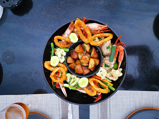 We had the shared sea food board, which came with two jumbo shrimps, two crabs, tuna, lots of Calamari and vegetables. It cost 4000 LKR. Starters and desserts were around 300-400 LKR. The views were priceless.