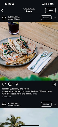 Read moreI wouldnt recommend to visit this place if your a local Sri lankan. They only give importance to the tourists. Its atleast understandable if the food was delivered within 30 mins. Me and 3 of my friends headed to this place very hungry on the 1st of Jan 2024 after a big night out on 31st. We ordered few beverages and some items on the menu. I personally ordered grilled chicken tacos. They took atleast 25 mins to deliver the drinks and 1 hour 15 mins to deliver the food while they delivered the food to the tourist who came after us. The tacos were not eatable because the grilled chicken was burnt and it tasted bitter. I did not eat more than half the taco. I dont understand why they do this and it was my first meal of the year which was very disappointing. I dont usually give bad review about a place but this should be brought to concern if they can give something thats not even eatable for a price of 2000+ You can see how my tacos look in the image i...