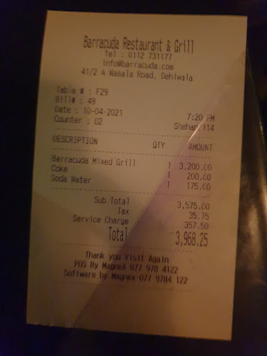 Read moreDate: 10/4/2021. Time: evening around 5:30pm. Yesterday, we had a disappointing experience at Barracuda Restaurant. We were planning to spend the entire night at Barracuda upon seeing the pictures, until the moment we left as soon as we experience a bad time. Not just the service was very slow, we were mislead by the servers to think that the Mixed Grill plater will have plenty of meat items. Unfortunately, when the food arrived, it was barely enough for 1 person because it had 1 sausage, couple of small pieces of liver, 1 half boiled egg and other burnt meat underneath which we couldn't figure out what it was and the half of the plater was covered in vegetables.