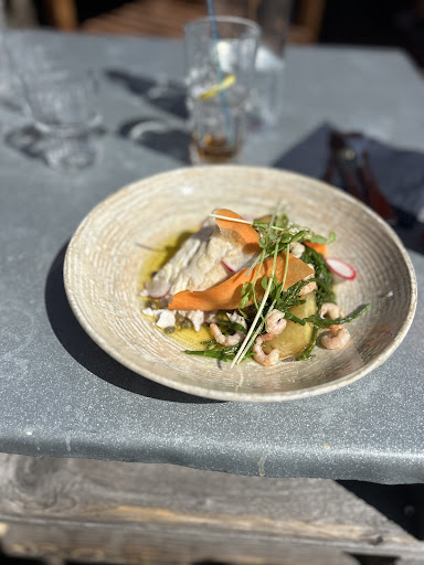 Tog en dagens fångst, fint upplagd, men, onödigt chili-indränkt (framgick inte att pesto rosson skulle vara het) som tog över totalt, en liten bit kolja (under täcke av de torkade oliverna? Svårt att avgöra), lökens ytterdelar hade antingen skalet kvar eller fel tillagat, för det var oätligt, mest bestod rätten av mängder med potatis, och en flottig, tunn, skaldjurssås? Inga skaldjur, så, antar att man menar buljong eller liknande? Borde ha lagts till en bit, örtkryddad, bruschetta eller nåt för att komplettera/väga upp rätten. (Ännu ett tips; man serverar bara en rätt där all garnityr är ätbar, persiljestjälkar är irriterande, behåll bara själva kronorna. Gäller även lökstjälkarna.)