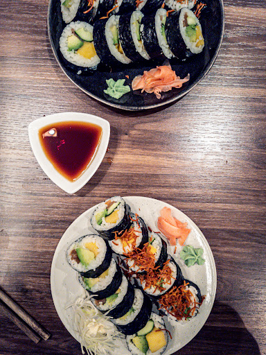 Entering Akai Koi Sushi is like an instant flashback to my time in Japan. The atmosphere is stunning, beautifully arranged and it makes you feel welcome from the get-go. The place is tiny, but that only helps the atmosphere. Located at Parkgatan, right at the main car traffic street through Gothenburg, it is not the most inviting place to walk to. So the nice atmosphere inside makes up for it. After the first “wow” from the atmosphere settles, the menu shows quite the variety with different types of sushi and rolls, also clearly marked as “vegan”, which is always a big plus in my world. But even some sides/appetisers such as Edamame and warm dishes inspired by Korea and Japan with Bibimbap or Gyoza. And on top of that they offer some Japanese beers (also alcohol free). So, it is more of a whole composition rather than just a sushi shack.